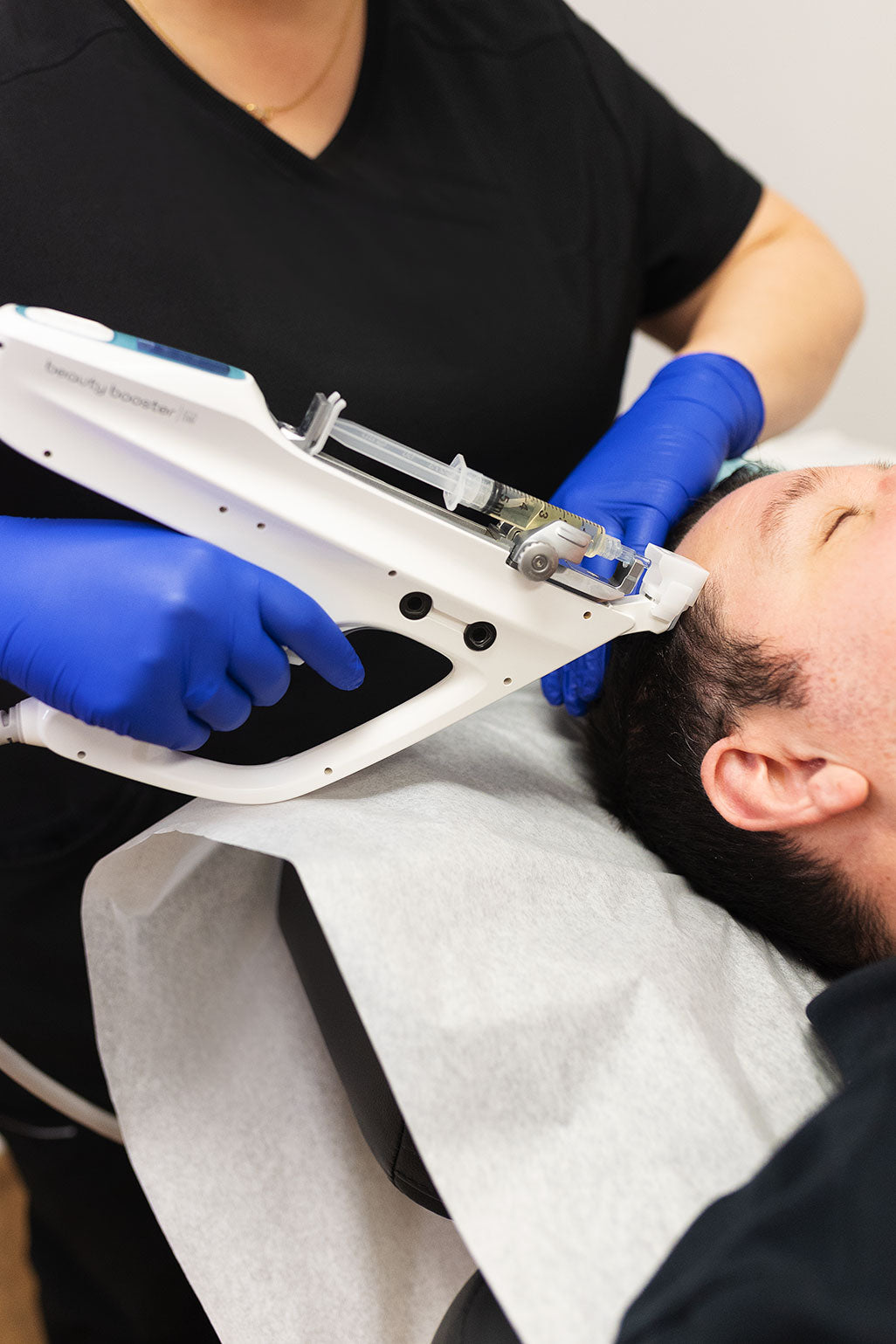 À l'aide d'un appareil de haute technologie, le plasma est précisément injecté dans les zones ciblées du cuir chevelu. Les injections sont stratégiquement réparties pour stimuler les follicules pileux et favoriser la croissance des cheveux.